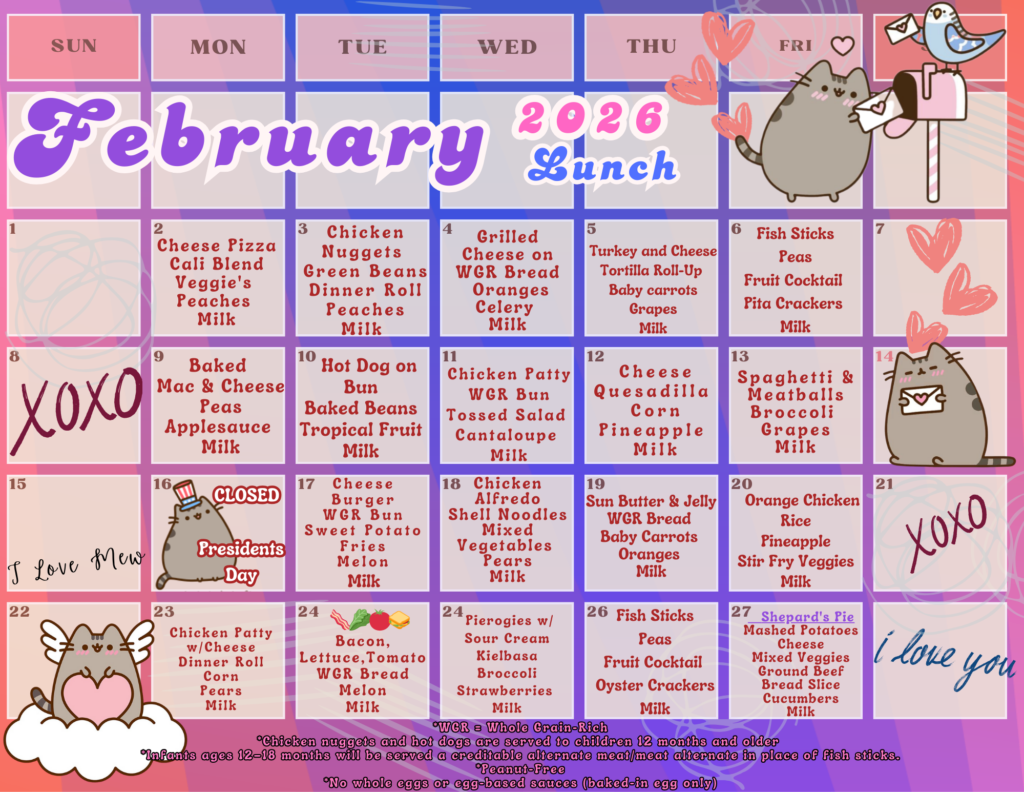 We serve breakfast, lunch, and an afternoon snack each day and follow CACFP guidelines to ensure all meals are healthy and well-balanced. We are currently a peanut-free and unbaked egg-free center to support the safety and dietary needs of all children in our care.